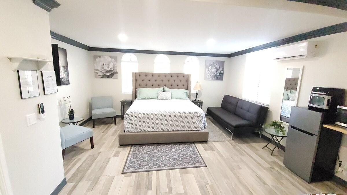 1BR/1BA Gäste-Suite ~ 350 sqft Privater Eingang (schlüsselloser Zugang) Persönlicher Thermostat Kostenlose Snacks, Getränke und Toilettenartikel Tempur-Pedic-Matratze mit Queensize-Doppelbett 65-Zoll-Smart-HDTV im Wohnzimmer 55-Zoll-Smart-HDTV im Schlafzimmer Minikühlschrank Elektrisches Doppelherd Keurig-Maschine Brettspiele Schreibtisch