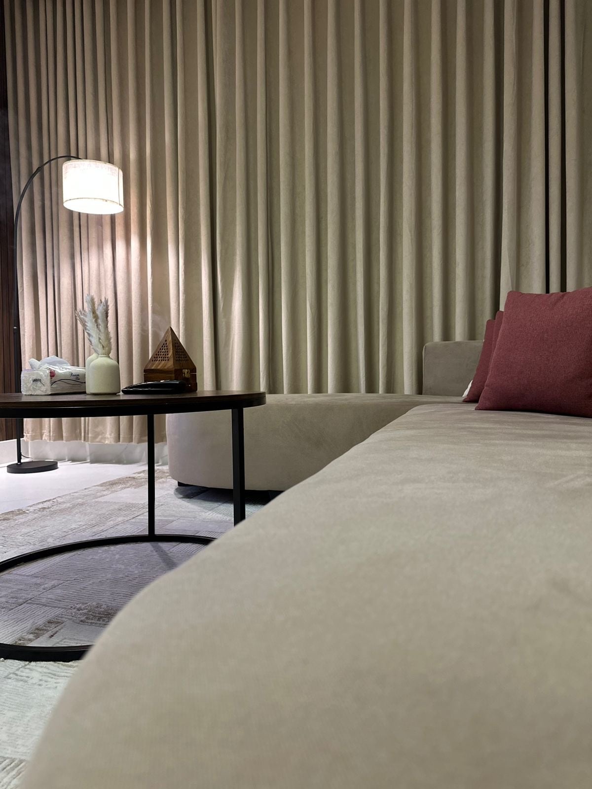 Eine sehr sorgfältig ausgestattete Einheit für Gäste mit feinem Geschmack. Mit Räumen mit natürlichem Licht in allen Zimmern, um den höchsten Komfort während Ihres Aufenthalts bei uns zu gewährleisten. Sie wurde unter Berücksichtigung des einfachen, luxuriösen Charakters entworfen, der von der ruhigen ländlichen Umgebung inspiriert ist, mit weißen Laken, Holzböden und einer Küche aus Naturholz mit Blick auf ein großes Wohnzimmer, das von Wandfenstern mit einem bezaubernden Blick auf den Arabischen Golf im Osten und die Stadt im Norden und Westen umgeben ist. In Al-Khobar, Al-Khuzama Viertel - Al-Azizia