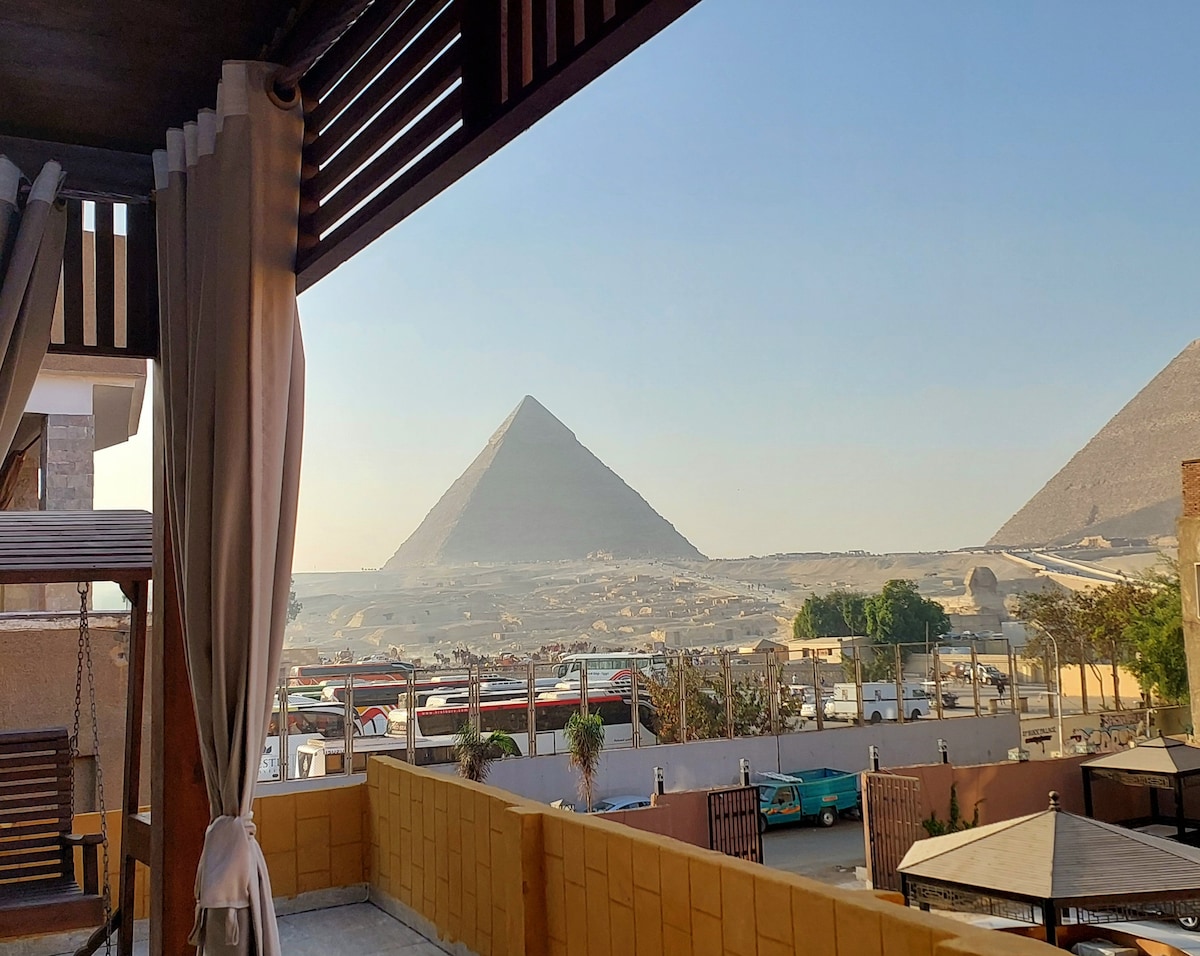 Dachwohnung mit vollem Blick auf die Pyramiden und die Sphinx. Riesige private Terrasse mit Sofa und Tisch und einer besonderen traditionellen Unterkunft zum Übernachten, Ausruhen und Genießen der wunderbaren Aussicht. Sichere Eingangstür. Küche komplett ausgestattet. Wohnraum mit Smart-TV. 1 Toilette allein und 1 großes Badezimmer, mit Dusche und 2 Händen waschen. 2 Zimmer, 1 groß mit Kingsize-Bett, Klimaanlage und Smart-TV und 1 mit Doppelbett. Das gesamte Apartment ist komplett neu. Komm, um einen außergewöhnlichen Aufenthalt bei uns zu genießen. Gern geschehen.☀️☘️