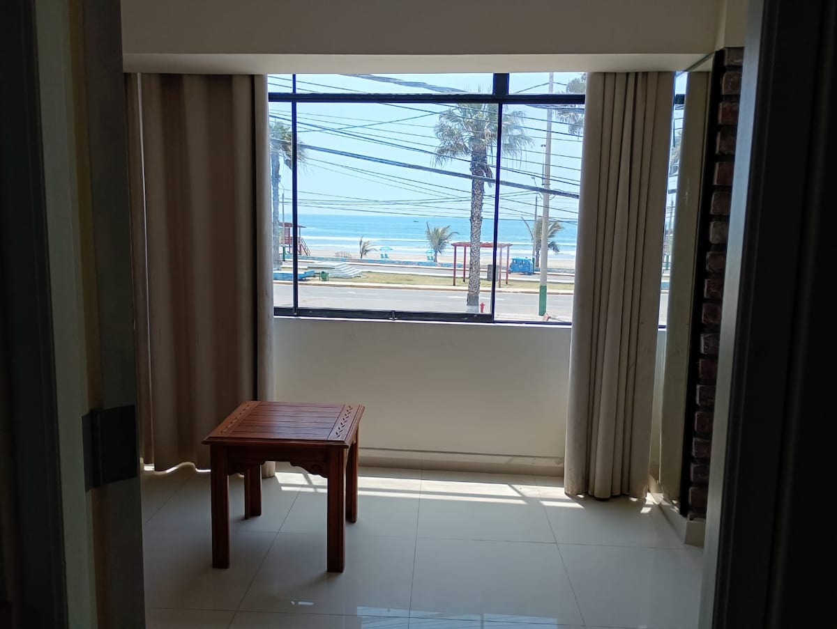 Departamento de estreno frente al mar, ubicado en el 2 piso. Sin ascensor. Lugar seguro y familiar. Contamos con una habitación principal con baño completo incluido, habitación secundaria con dos camarotes de plaza y media y baño completo. Cocina completamente amoblada y menaje incluido. Sala con con baño de visitas y un lindo comedor. Tv con cable, y wifi en todo el departamento. Terraza con vista al mar. Cerca a restaurantes.