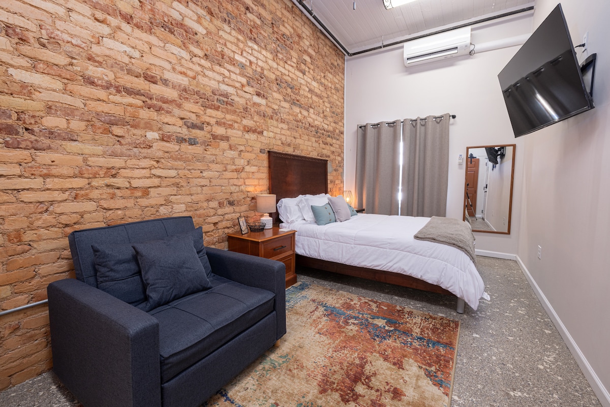 Das Hartwell Suites liegt in der historischen Innenstadt von Hartwell und bietet ein einzigartiges Boutique-Hotelerlebnis mit modernen Suiten mit historischem Charme. PLATZ FÜR 4 Queensize-Doppelbett sowie ein Ausziehsofa mit zwei Doppelmatratzen. VOLL AUSGESTATTETE KÜCHE mit Kühlschrank, Mikrowelle, Geschirrspüler, Kaffeemaschine und einem Induktionsherd mit zwei Flammen. Die Mikrowelle kann auch als Umluftofen und als Heißluftfritteuse verwendet werden. ADA-KONFORM Das Badezimmer verfügt über eine Rolldusche, große Türen und einen offenen Grundriss.