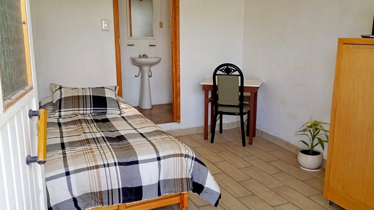 Habitación con 4 camas individuales (2 sobre un tapanco). Cuenta con TV con cable e internet. Tiene un baño completo que está fuera de la habitación, cruzando el patio. Se comparte entre los 4 huéspedes de esta habitación. Tenemos estacionamiento.