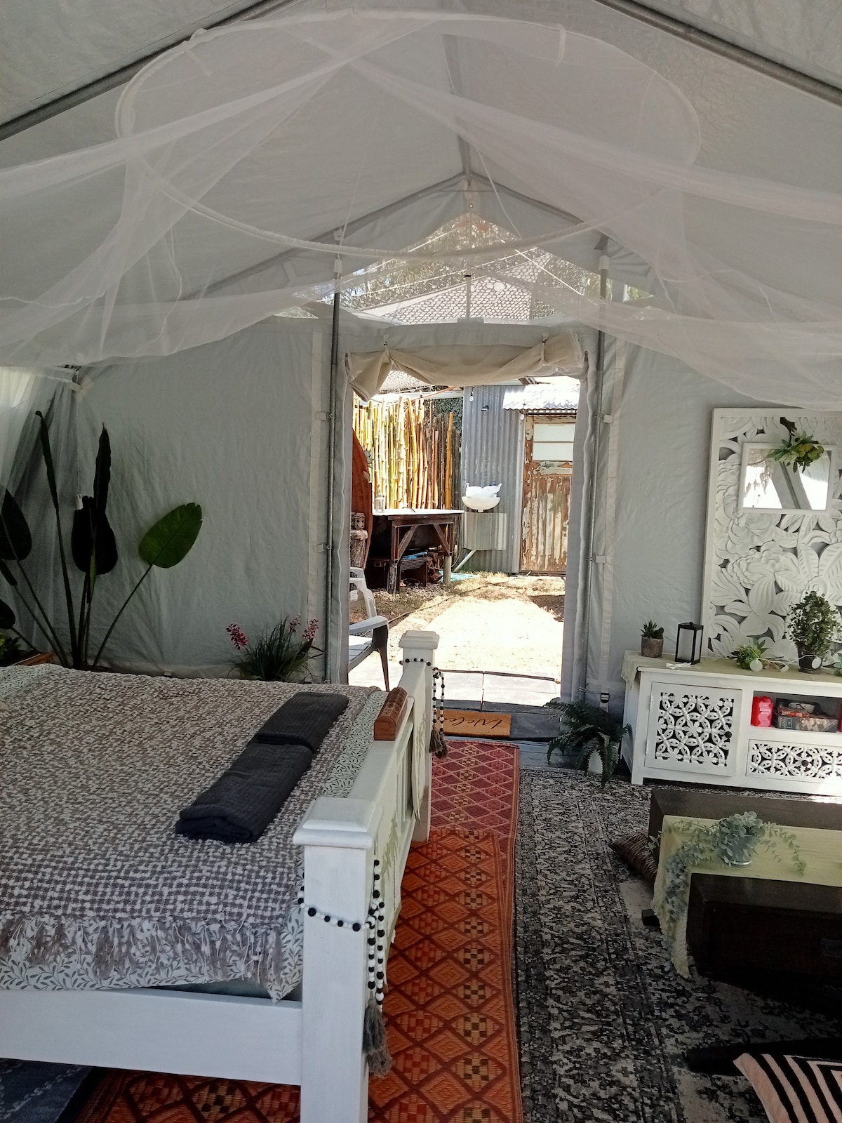 Das große Zelt im Safari-Stil ist geräumig und verfügt über ein Queensize-Bett, Sitzgelegenheiten und viel Platz zum Bewegen. Das Zelt befindet sich in seinem eigenen Bereich des Gartens mit Blick auf Berge und einer persönlichen Feuerstelle für entspannte Abende. Sternenbeobachtung ist schwer zu widerstehen. Haustiere sind willkommen. Umgeben von Gärten und Ackerland, aber nur eine kurze Strecke vom Strand und den Annehmlichkeiten entfernt. Nur 2,5 km zum Zentrum von Tilba, 5 Minuten zum Strand und 15 Minuten nach Narooma und Bermagui.