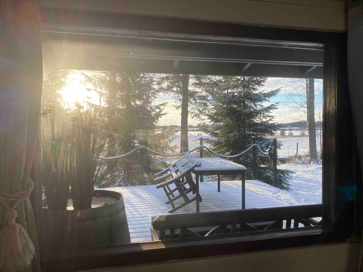 Das Cottage ist eine ausgezeichnete Wahl für ein Paar oder einen Einzelaufenthalt. Du kannst von der Haustür aus in die Natur treten. Die Hütte befindet sich in einer malerischen Pferdefarm. Die Küche ist voll ausgestattet und verfügt über einen Kamin, um die richtige Stimmung zu schaffen. Das Schlafzimmer verfügt über ein ausklappbares Schlafsofa. Die Sauna verfügt über einen Holzofen und gibt schöne Löyly. Der See ist 300 Meter von der Hütte entfernt.