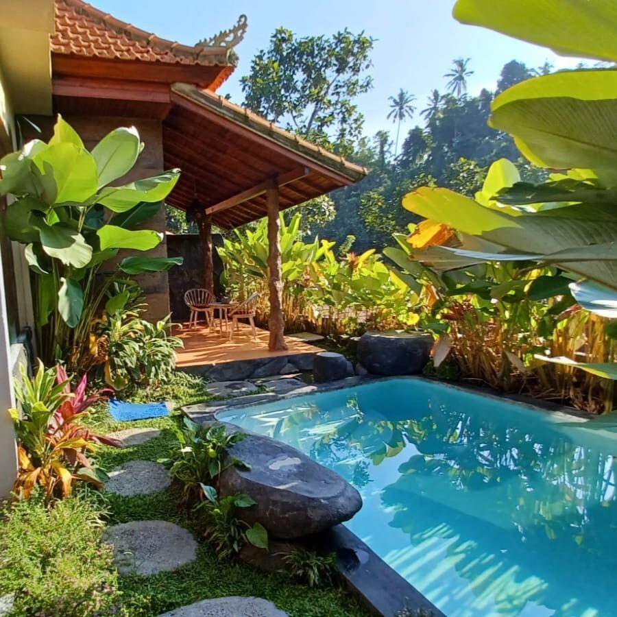 Sradha Villa im Joglo-Stil im Dorf Penestanan, ruhig und friedlich, ca. 300 m von der Hauptstraße entfernt Kleiner privater Pool Schlafzimmer mit Klimaanlage Gartenlaube Fischteich Grüne und blühende Pflanzen Sitz- und Essbereich im Freien auf der Veranda Schöner Garten Reinigungsoptionen Kann Touren/Autos arrangieren