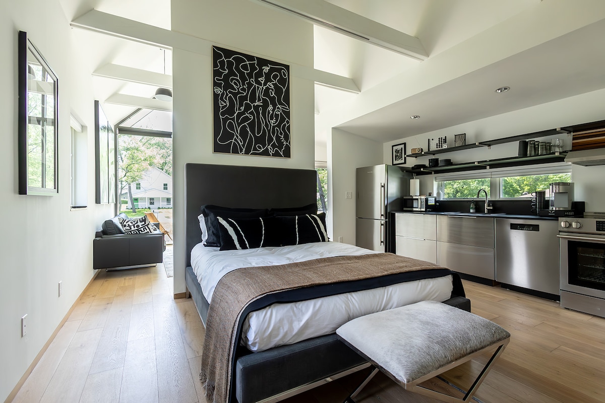 This 400 sq. ft. guesthouse (studio) on a historic property in Westwood, KS has recently been fully renovated and furnished. It has a completely equipped kitchenette, comfortable living area, along with a queen-size bed. The guesthouse also includes a washer/dryer off the kitchenette. The guesthouse is a separate dwelling located on a half an acre property which includes the original farmhouse built in 1889 - the guesthouse added in 1920. Westwood, Kansas is 2 miles from the Country Club Plaza.