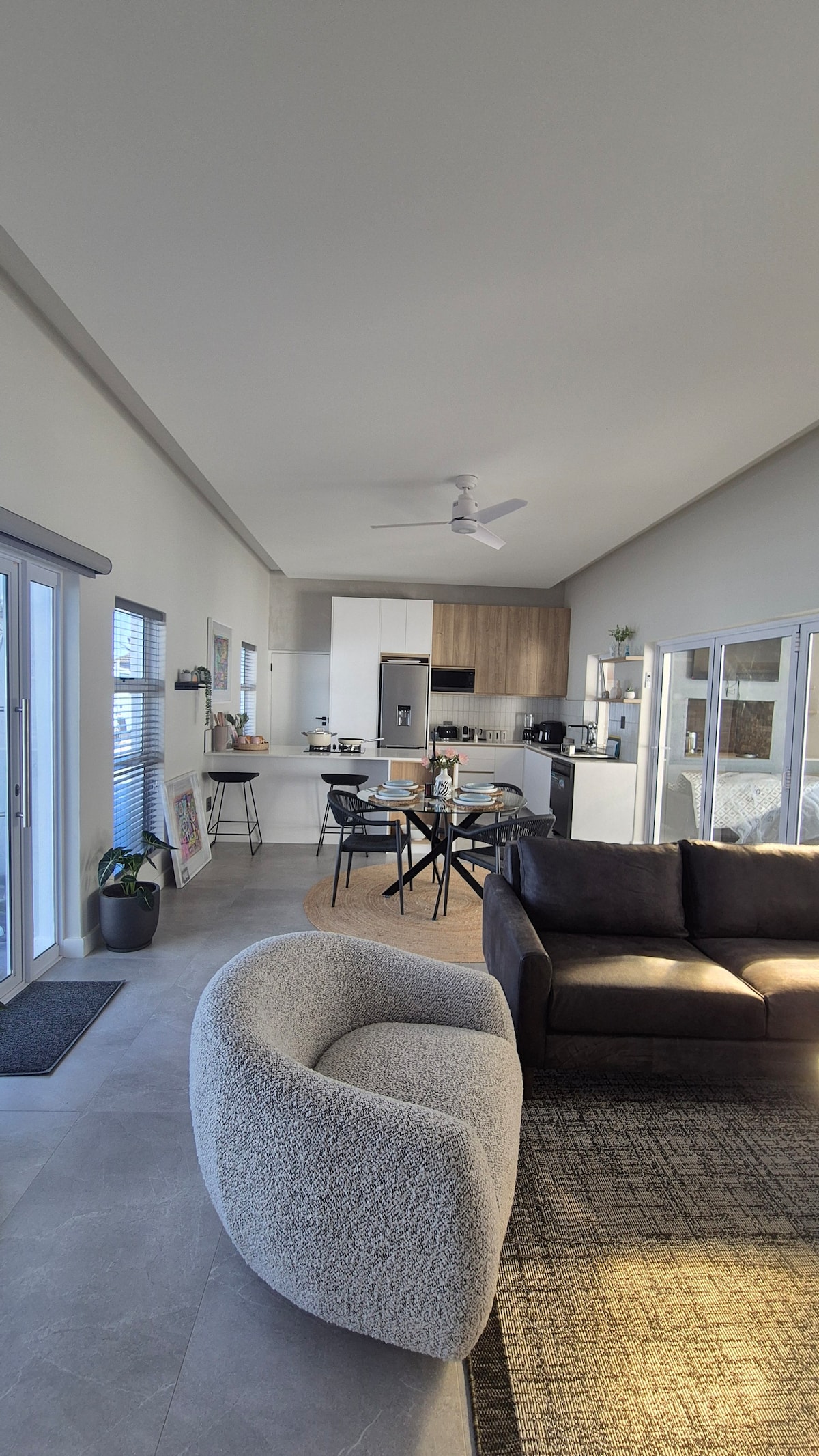 Unwind in an ocean view open-plan petite apartment (tiny and compact) on the West Coast nestled in a peaceful estate between Velddrif and Dwarskerbos, with a "Greek-style" stairway. Guests will appreciate the stunning ocean views from the balcony and morning walks on the beach. Truly a serene and relaxing breakaway. Guests can enjoy a shared swimming pool on the main property and have a separate boma in the private mini-courtyard. The beach access gate is a 1-2 minute walk from the unit.