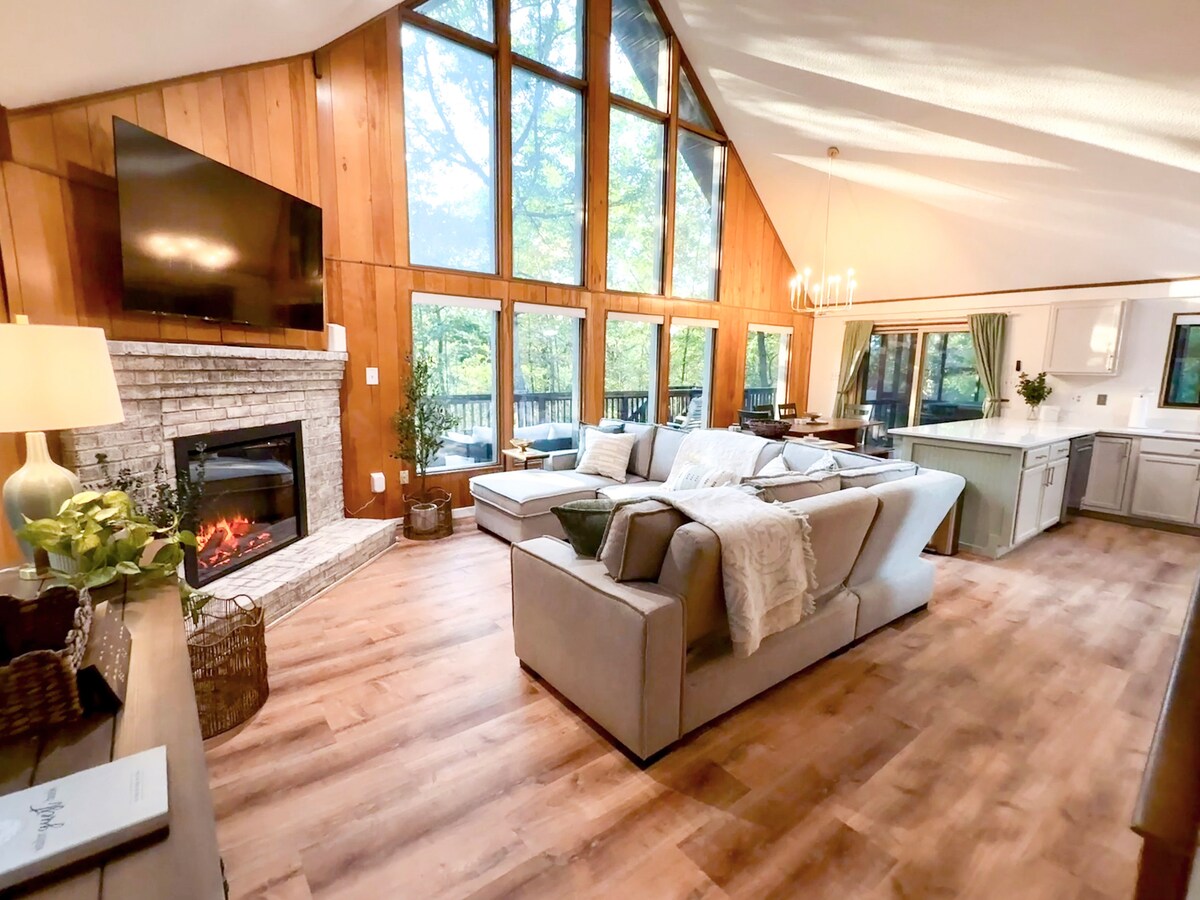Hol das Beste aus dem wilden und wunderbaren West Virginia in diesem neu renovierten Blockhaus 20 Minuten vom Stadtzentrum von Berkeley Springs entfernt heraus. Genieße die waldreiche Aussicht von der großen Veranda, mach S'mores rund um die Steinfirestelle, tauche in den Whirlpool im geschlossenen Sonnenraum ein, mach es dir mit einem Buch vor dem Holzofen gemütlich und mach es dir im kinoartigen Loft gemütlich. Du hast Zugang zu einem privaten See und unglaublichen Wanderwegen, die nur wenige Minuten von der Hütte entfernt sind.