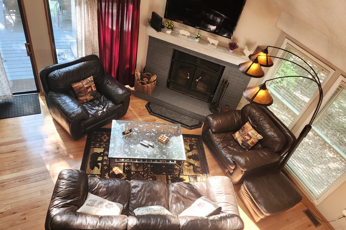 Erlebe den Inbegriff von Luxus in unserer atemberaubenden A-Rahmen-Hütte, die inmitten der ruhigen Wälder liegt. Dieser moderne Rückzugsort bietet großzügige Annehmlichkeiten und einen atemberaubenden offenen Wohnraum mit raumhohen Fenstern, die dich in die Schönheit der Natur eintauchen lassen. Gönne dir den privaten Whirlpool, entspanne dich an der Feuerstelle und entfessle deine kulinarischen Fähigkeiten in unserer voll ausgestatteten Küche. Die große, abgeschirmte Veranda bietet eine ruhige Oase, während nahe gelegene Wanderwege, Golfplätze und ein Spa einen unvergesslichen Urlaub bieten!