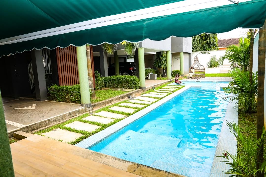 Schöne Villa mit ausgestatteter Küche, komplettem Badezimmer, Büro, WLAN, Klimaanlage, TV, in einem grünen und ruhigen Anwesen, mit Swimmingpool in Abidjan, Riviera 3. Die Buchung beinhaltet eine kostenlose wöchentliche Reinigung, Bettwäsche, Handtücher, Seife sowie kostenlose Wäsche und Bügeln der Kleidung der Gäste. Der Pool und der Garten können mit anderen Gästen geteilt werden. Für einen dritten Gast steht ein zusätzliches Bett zur Verfügung. Die Unterkunft ist ruhig und hat viele Bäume. Sie liegt 10 Gehminuten von Geschäften und Restaurants entfernt.