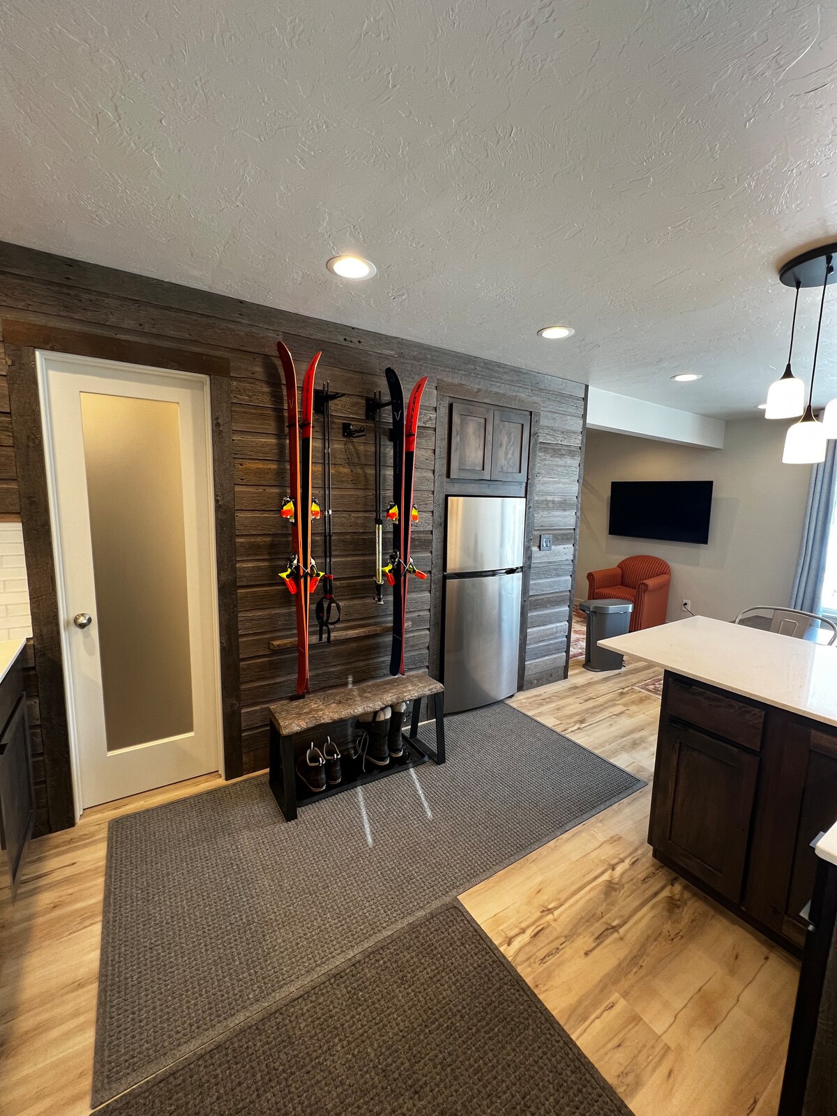 Gemütliche Ski-Wohnung im ersten Stock in der Nähe des Berges. Genieße die Privatsphäre von zwei Schlafzimmern, eines mit Queensize-Bett und eines mit Etagenbetten. Die Küche ist mit den Grundlagen bestückt. Hill Condos sind bequem zum Skiberg, nur wenige Gehminuten vom Konferenzzentrum und Mountain Village mit all seinen Annehmlichkeiten entfernt. Die Wohnung bietet schlüssellosen Zugang, Bluetooth-Stereo und Smart-TVs, ganz zu schweigen von der schönen Aussicht auf den Lone Mountain. Sie ist 440 Quadratfuß groß und befindet sich weniger als eine halbe Meile vom Resort entfernt.