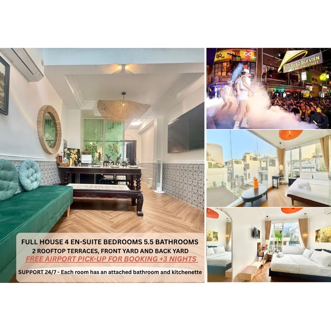 Dieses Inserat beginnt am 1. September 2025. Alle vorherigen Buchungen werden nicht bestätigt. Vielen Dank für Ihr Interesse! Die Unterkunft bietet den Komfort, in der Nähe berühmter Attraktionen zu sein, während du einen ruhigen Raum zum Ausruhen beibehältst. Dies ist die ideale Wahl für große Gruppen, die eine geräumige, gemütliche Unterkunft suchen. 200 m zur Bui Vien Walking Street 1 km zum Ben Thanh Market 1,6 km zur Nguyen Hue Walking Street Das Haus verfügt über 2 Schlafzimmer, 3 Betten und 3 Badezimmer.
