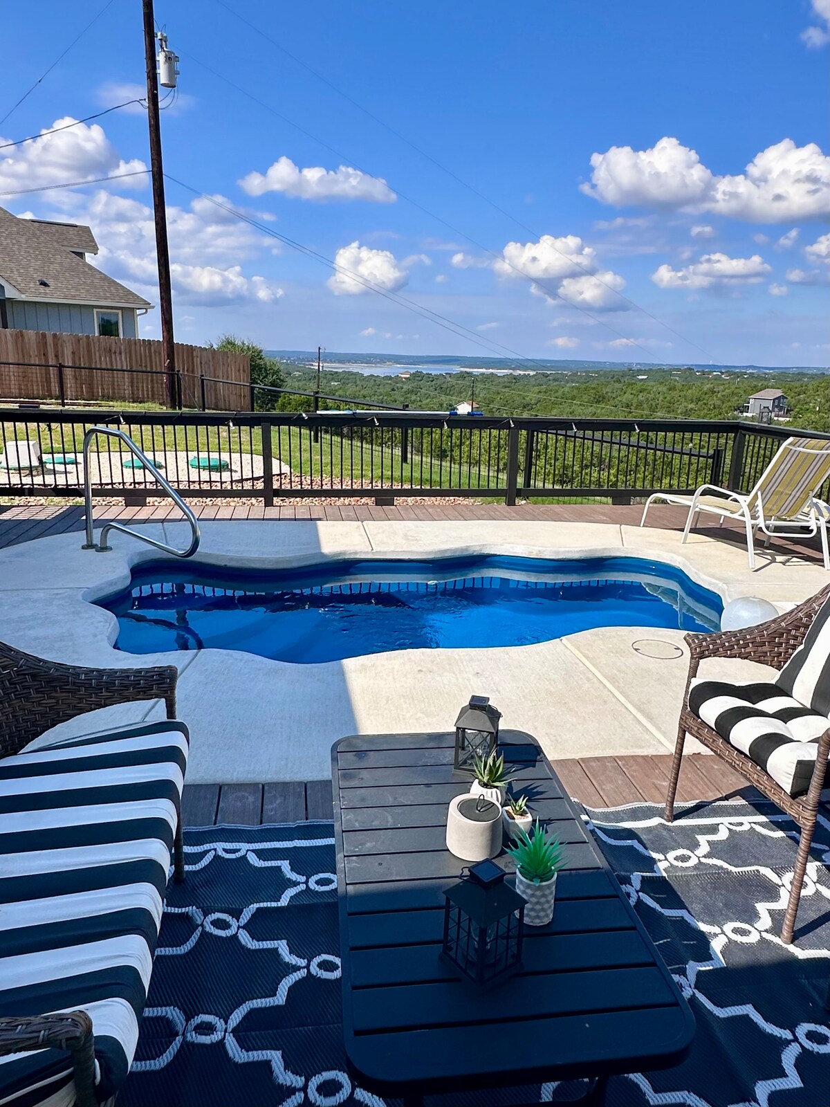 Willkommen im The Overlook Tower! Dieses Haus mit 2 Schlafzimmern und 1 Badezimmer ist perfekt für Paare, kleine Familien und Seeliebhaber, die einen ruhigen Urlaub suchen. Zu den Annehmlichkeiten gehören ein Whirlpool für 5 Personen, eine große Terrasse mit Liegestühlen/Chaiselongues, Panoramablick auf das Texas Hill Country, ein Wohnmobilanschluss/Tesla-Ladegerät, 2 Smart-TVs, 2 Sofas, ein Esstisch und eine voll ausgestattete Küche. Jedes Zimmer ist ausgestattet, damit du deine Reise mit Komfort genießen kannst! Genieße deinen Aufenthalt!