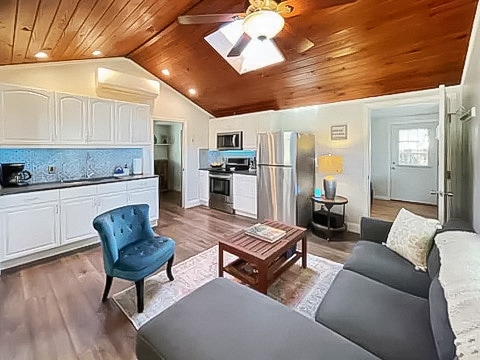 Entspanne dich in unserem stilvollen, einzigartigen Tree Loft. Wir haben ein über 800 Quadratfuß großes Fotostudio in eine trendige Wohnung umgewandelt. Die Decke des Wohnzimmers erreicht eine Höhe von 20 Fuß. Über dem Wohnzimmer schwebt das Schlafzimmer mit Blick auf die Baumkronen. Das Badezimmer befindet sich direkt unter dem Schlafzimmer am unteren Ende der Treppe. Großzügige Fenster bringen die Außenwelt herein. Tritt auf die Veranda für deinen Morgenkaffee oder in den kleinen, komplett eingezäunten, privaten Garten.