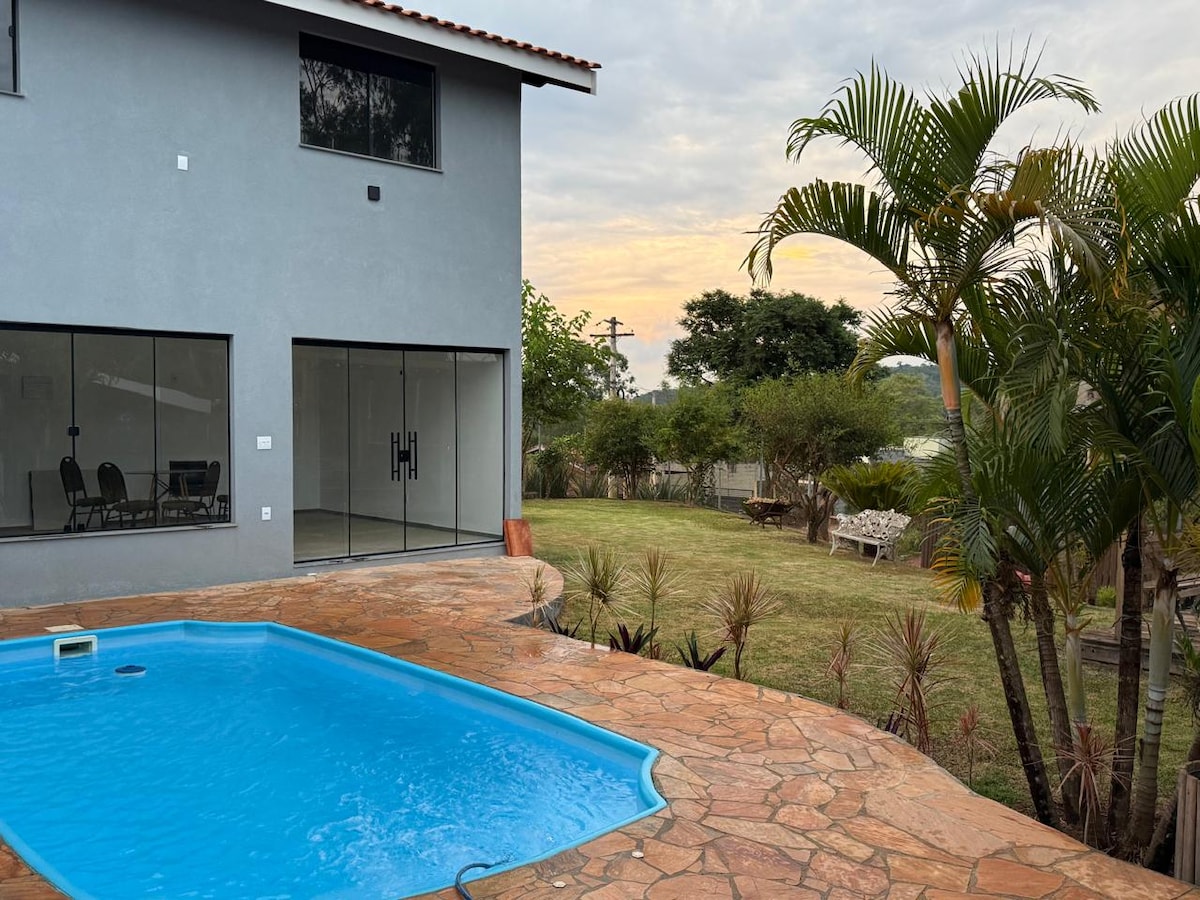 Chácara com piscina aquecida e churrasqueira, excelente espaço para descansar com a família, casa bem espaçosa, com cinco quartos, sendo duas suítes. A casa possui uma vista maravilhosa, pois ela se localiza numa parte mais alta do bairro. Conta com uma grande garagem que acomodam 4 carros facilmente.