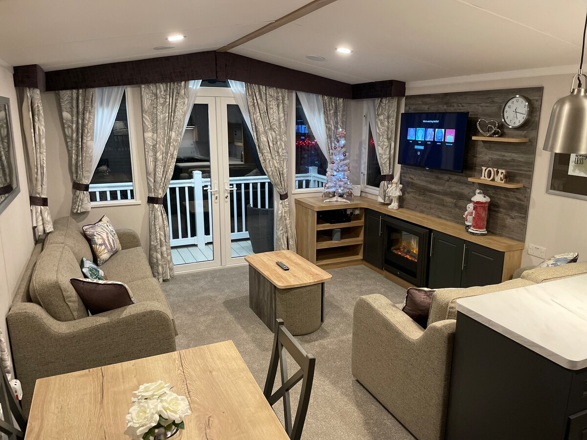 Entspanne dich mit der ganzen Familie in dieser ruhigen Unterkunft in unserem Wohnwagen im Mini-Lodge-Stil mit atemberaubendem Meerblick und beobachte schöne Sonnenuntergänge. Direkt am Ocean Edge Holiday Park, Heysham, Morecambe. Entspanne dich an sonnigen Tagen auf der großen umlaufenden Terrasse. Die Küche und der Wohnbereich sind offen und geräumig mit allen Annehmlichkeiten, die Sie für Ihren Aufenthalt benötigen. Nur 5 Autominuten vom historischen Dorf Heysham mit Cafés und einem Pub für einen Zwischenstopp entlang des schönen Küstenspaziergangs entfernt.
