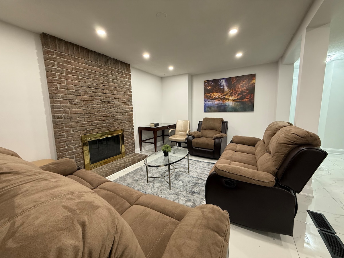 ⭐️ 98″ IMMERSIVE CINEMA⭐️ Experience a VIP Theather Setup w/ a massive 98" Smart TV, soundbar, subwoofer, sleek fluted panels, & soft mood lighting ⭐️RELAX & RECHARGE⭐️ - Unwind in the Master Suite w/ a Smart TV & electric fireplace! -Step into private backyard featuring a BBQ (year-round) and a stone waterfall fountain (Summer/Fall) 🏡 Private 3BR/2BA Bunglow 🍳Modern Chef's Kitchen ✈️ ~15 min toPearson Airport 🛍️ ~2 min to Mall 🚆~5 min to GO Station