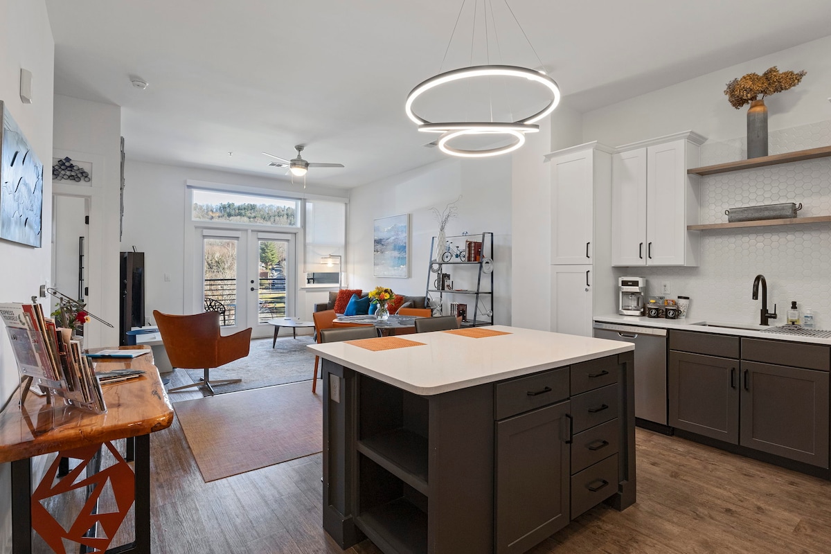 1 Schlafzimmer, 1 Badezimmer, eine offene Küche, ein Wohnzimmer und ein Balkon. Neue Geräte, Bettwäsche und Möbel schaffen eine atemberaubende Unterkunft für Sie und Ihre Lieben, um sich zu entspannen und zu genießen. Nur einen kurzen Spaziergang von Ashevilles lokalen Restaurants, Brauereien, Geschäften und Galerien entfernt, bist du im Stadtzentrum und kannst gleichzeitig die Berge genießen, die dich umgeben. *Mietvertrag erforderlich*
