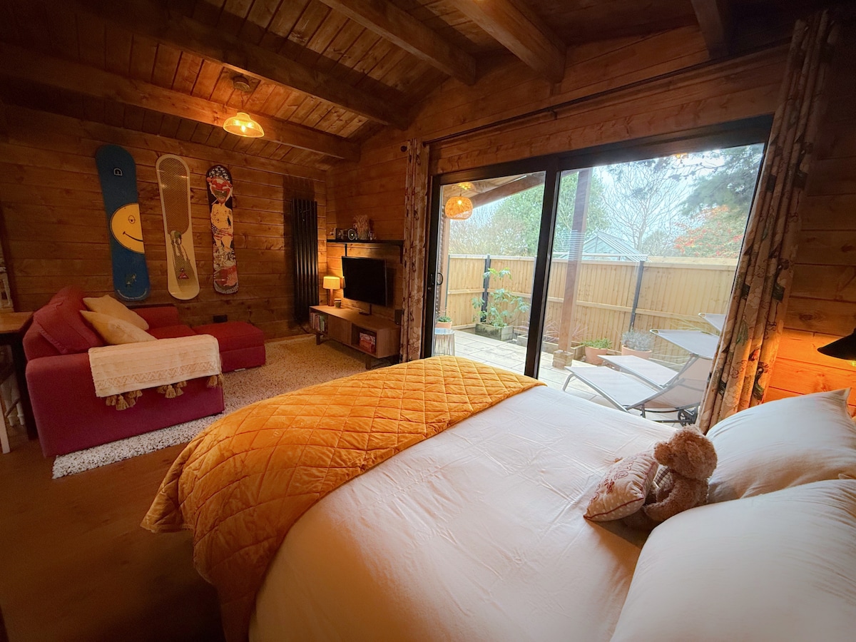 Duck Lodge, a boutique log cabin, is located in a serene village. This all-wood home is surrounded by a lush garden, offering a tranquil location. The well-equipped interior showcases eclectic furnishings, Sky TV and a sound system. Your private 8 seater hot tub is exclusively yours between 4-9 pm located on the main house's patio, 25 meters up from the lodge. To ensure a peaceful experience, we suggest enjoying up to 2 hours of soaking time - perfect for unwinding in comfort and privacy 🥂🍾