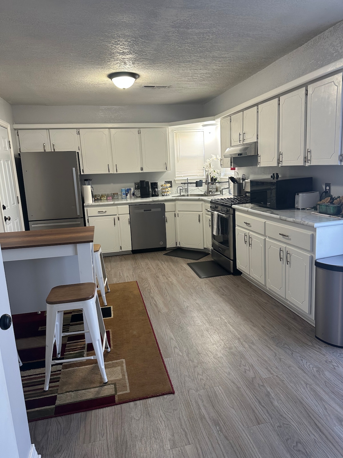 Relax with your family at this peaceful place. It’s quiet, perfect for guests traveling on a budget. Self check in and check out, Bedrooms come with 2 separate Queens and full size bunk beds. walk in closets and TVs in all rooms. Kitchen: Utensils, plates pots and everything that you may need to cook a small meal. Sitting area: Pullout bed, dining table. Washers and dryers, fenced backyard and easy access to the highway to get to entertainment centers, shopping malls and everything!