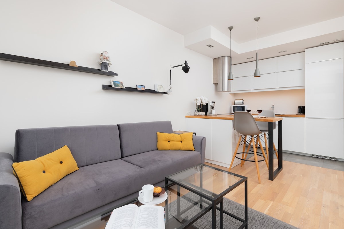 Enjoy a peaceful and stylish stay at this centrally-located place. A newly built, beautifully furnished apartment, perfect for a quiet stay in the heart of Gdańsk. Located on the greenest side of the city center, right next to Góra Gradowa. Although historical and cultural sights, shops, and restaurants are only a 10-15 min walk away, the area feels peaceful and secluded. The place offers a unique, cozy, and very comfortable design, perfect for a couple and a weekend escape.