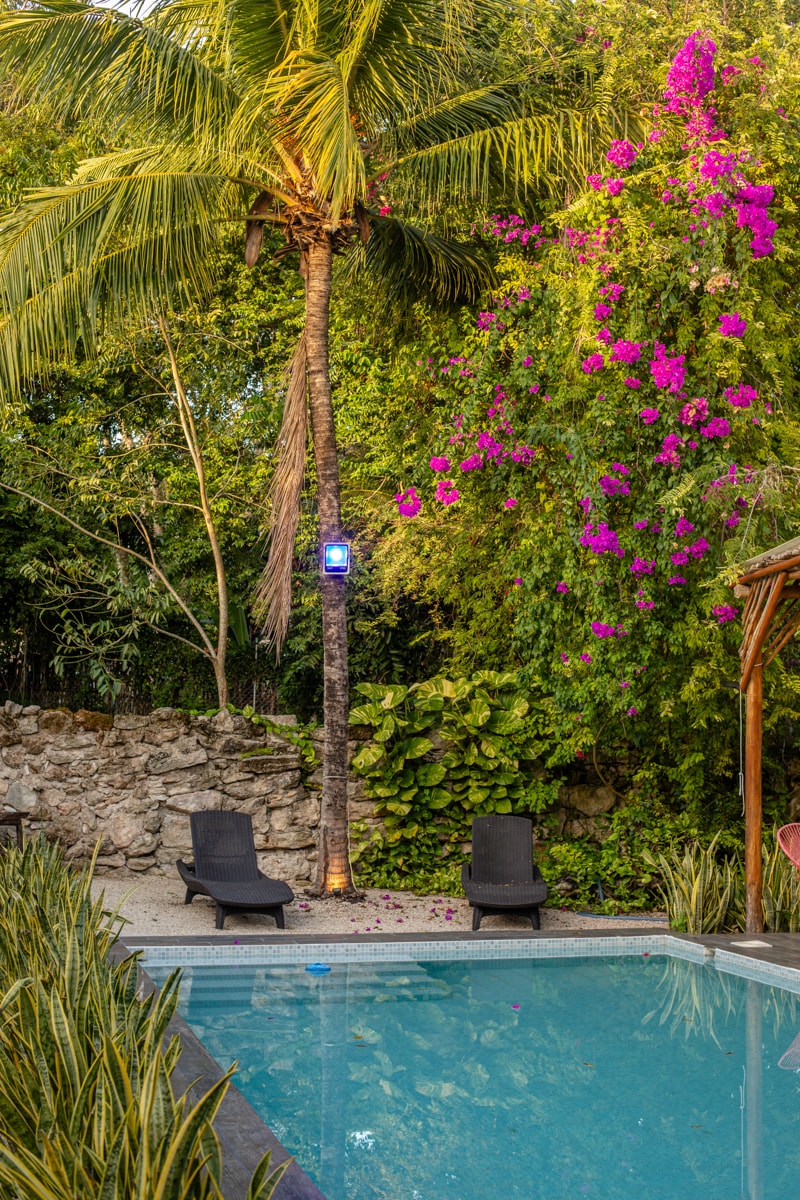 Relajado y rodeado de naturaleza, así es el espacio donde disfrutaras de un patio con palmeras, mientras le pides a Alexa que te ambiente con música de reggae para sentir el caribe mexicano. Además cerca de todo; como la bahía con su explanada a tan solo 5 cuadras, donde podrás disfrutar de las tradicionales marquesitas, o el aeropuerto y próximo Tren Maya a 5 minutos de distancia. Una estancia diseñada para que descanses y vivas una bonita experiencia.