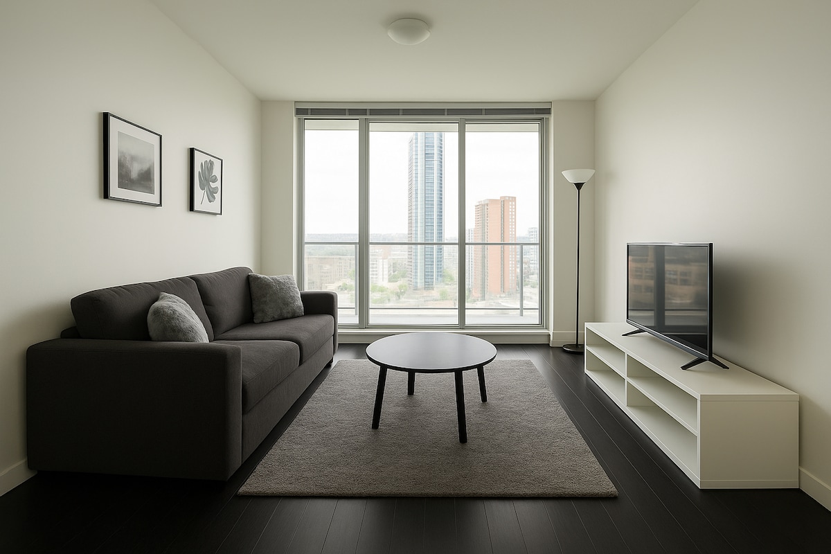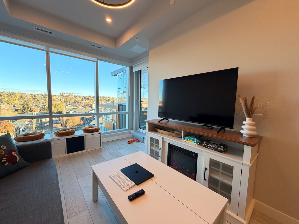 About this space This beautiful 1 bed and 1 den apartment is your home away from home. It offers all the convenience and comfort you need to make your trip memorable and comfortable Modern living space with floor to ceiling window that lets in plentiful and beautiful natural light, and offers amazing views of Downtown Calgary and Rocky Mountains in the distance Unbeatable location offers exceptional convenience to amenities and entertainment experiences. It's close to all public transportations.