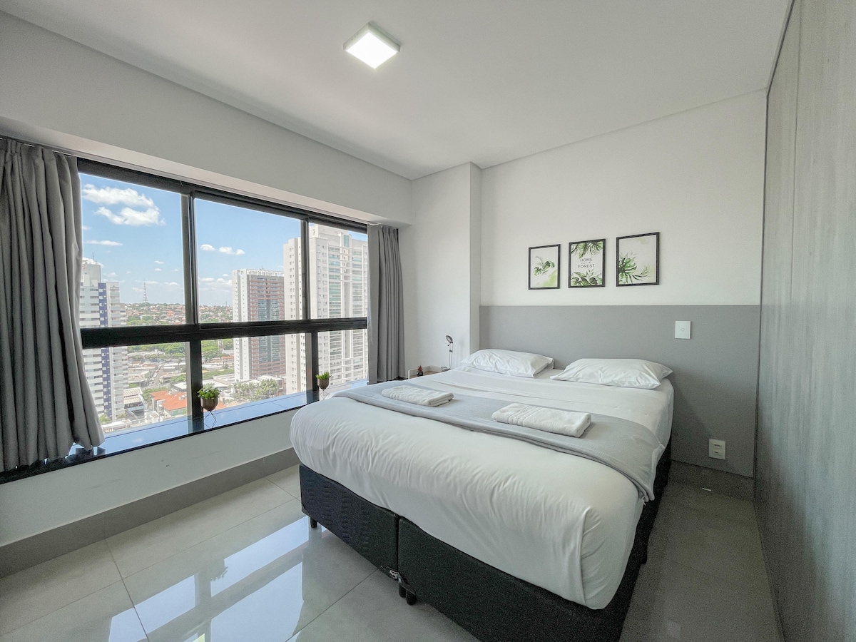 Sehr luxuriös und praktisch in der besten Region von Campo Grande. In der Nähe der Avenida Afonso Pena und des Einkaufszentrums Campo Grande. Das Studio verfügt über eine Klimaanlage, ein Queensize-Bett, einen 43-Zoll-Fernseher, eine voll ausgestattete Küche, ein ausziehbares Sofa und einen Esstisch Wir haben ein Kinderbett und zusätzliche Matratzen. Wir haben Optionen für Frühstückskorb und romantisches Dekorationspaket. In den Vertigo Premium Studios haben Sie Zugang zur Beauty Hall, zur Sauna und zum beheizten Infinity-Pool.