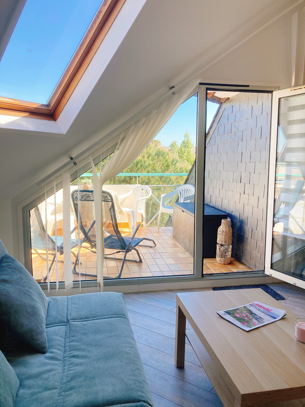 Magnifique duplex vue sur l'océan à Carnac, à 50m de la Grande Plage, à proximité des commerces (boulangeries, traiteur, restaurants...), loisirs, boutiques, yacht-club... Il peut accueillir 2 voir 3 personnes et comporte une chambre avec 1 lit double à l'étage (160X200) un séjour 1 convertible double (140X200), une cuisine, une salle d'eau et des wc.. Les draps propres seront à votre disposition sur le lit. Arrêt de bus à 2 minutes à pieds.