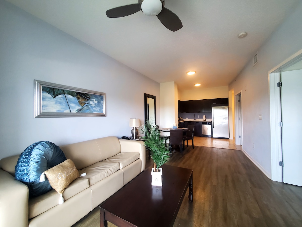 1st floor Corner Unit 2-Bedrooms 2-Baths WALK OUT from living room to pool area! 7-person balcony! Full kitchen King bed in each bedroom, a sleeper sofa in the living room. Dog park on property - bring your pooch! Electric car charging station on property Free parking Free shuttle to all the Disney parks 360 degree pool with hot tub, putt putt, basketball, volleyball, ping pong, and Giant Connect Four Indoor and outdoor restaurant/bars 4-5 miles from Disney World and Disney Springs