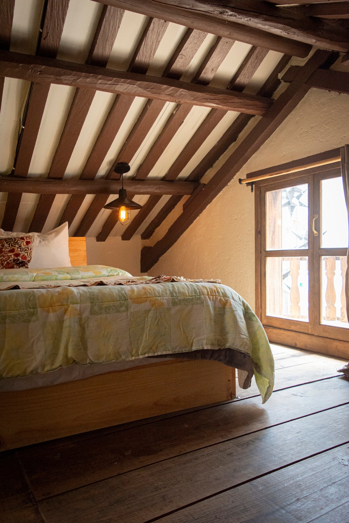 Amplio Departamento de dos plantas a solo 5 cuadras de la concurrida calle Real de Guadalupe. Se encuentra en una propiedad muy segura y con vista a un hermoso jardín. Cuenta con 1 cama king size, 1 cama matrimonial, sala de tv, baño con vestidor, cocina equipada, sala con chimenea, internet WIFI de alta velocidad y una cómoda oficina. Terraza con su mesa, sillas y hamaquero. También cuenta con lavadora y secadora en las instalaciones para uso de los huéspedes.