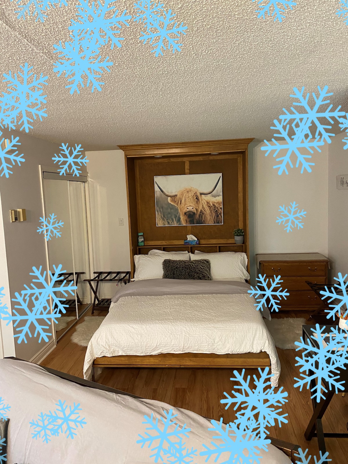 BITTE LESEN! Mt. St. Louis & Horseshoe Valley vor der Haustür! Dies ist eine helle, große und private GÄSTESUITE (Kellerwohnung). Whirlpool, Terrasse, Feuerstelle und abgelegener Waldweg, um die Natur zu genießen. Die Küche ist mit einem Induktionskochfeld und allen notwendigen Dingen ausgestattet, sogar einem Weinflaschenöffner :) Offenes Wohnzimmer/Küche/Esszimmer mit TV & Roku. Das Schlafzimmer ist ein Kunstwerk: dunkel, geheimnisvoll und romantisch! Maßgefertigtes Queensize-Bett aus verwittertem Scheunenholz, das von unserem Grundstück stammt.