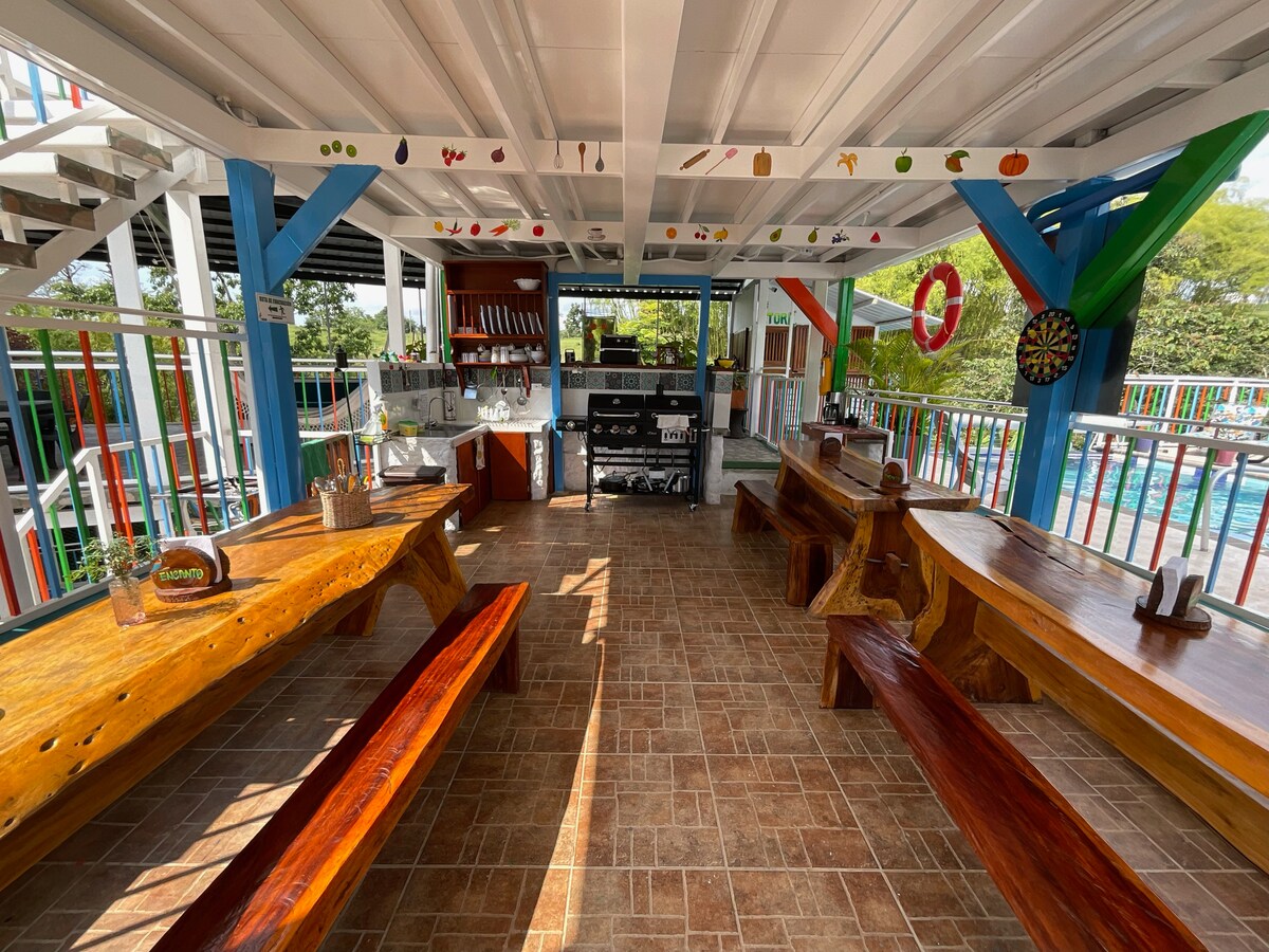¡Bienvenido a nuestro refugio en el Quindío! Descubre serenidad en 4 acogedoras habitaciones con 9 camas. Relájate en el jardín y en la piscina. Prepara delicias en la cocina equipada o disfruta de la zona BBQ. Con 4 baños, garantizamos comodidad. A 5 minutos del Parque del Café y 20 minutos de Panaca, estamos cerca de todos los atractivos turísticos del Departamento cafetero. ¡Tu escape perfecto a la naturaleza y la diversión! ¡Te esperamos!