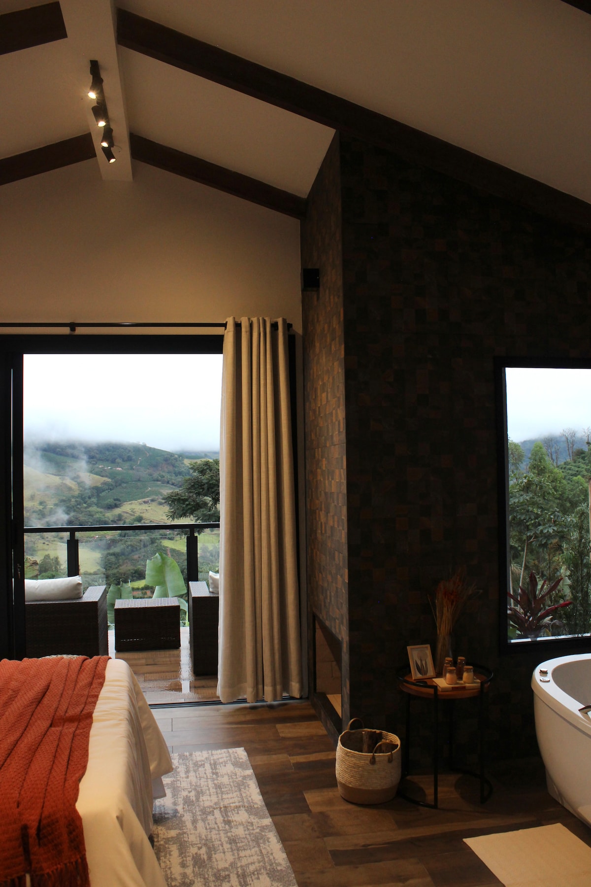 Refúgio romântico em meio à natureza, ideal para casais. Chalé estilo suíço (A-frame) em sítio cercado por cafezais, com rio e cachoeira particulares. Possui banheiras externas com vista para a Serra da Mantiqueira, jacuzzi interna, fogueira, churrasqueira, quadra de beach tênis, cama-balanço, sauna seca com vista e projetor interno com telão de 100”.