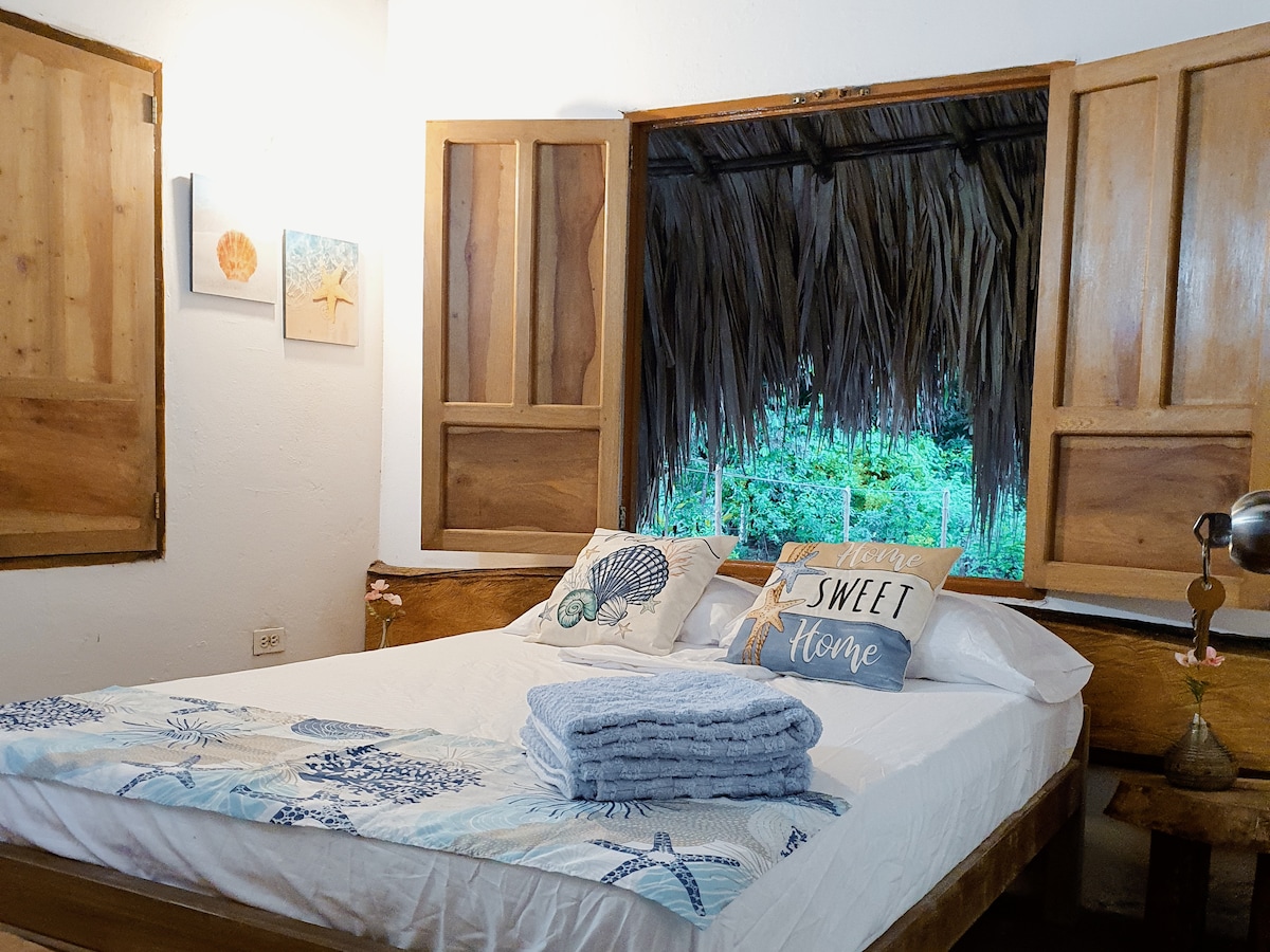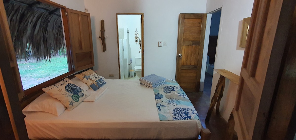 La habitación Pulpo tiene 1 cama doble queen, para albergar hasta 2 personas. La Coralina azul, es un hotel ubicado en un ambiente natural a 5 minutos caminado del mar, cuenta con 2 cocinas compartidas, 2 zonas de comedor, zonas interior y exterior de hamacas. Para los niños hay una zona con arenero y columpios. Es un sitio maravilloso. El mar y la naturaleza te invitan a ser feliz allí los pajaros y los monos te saludan en la madrugada. Relájate en esta escapada única y tranquila.