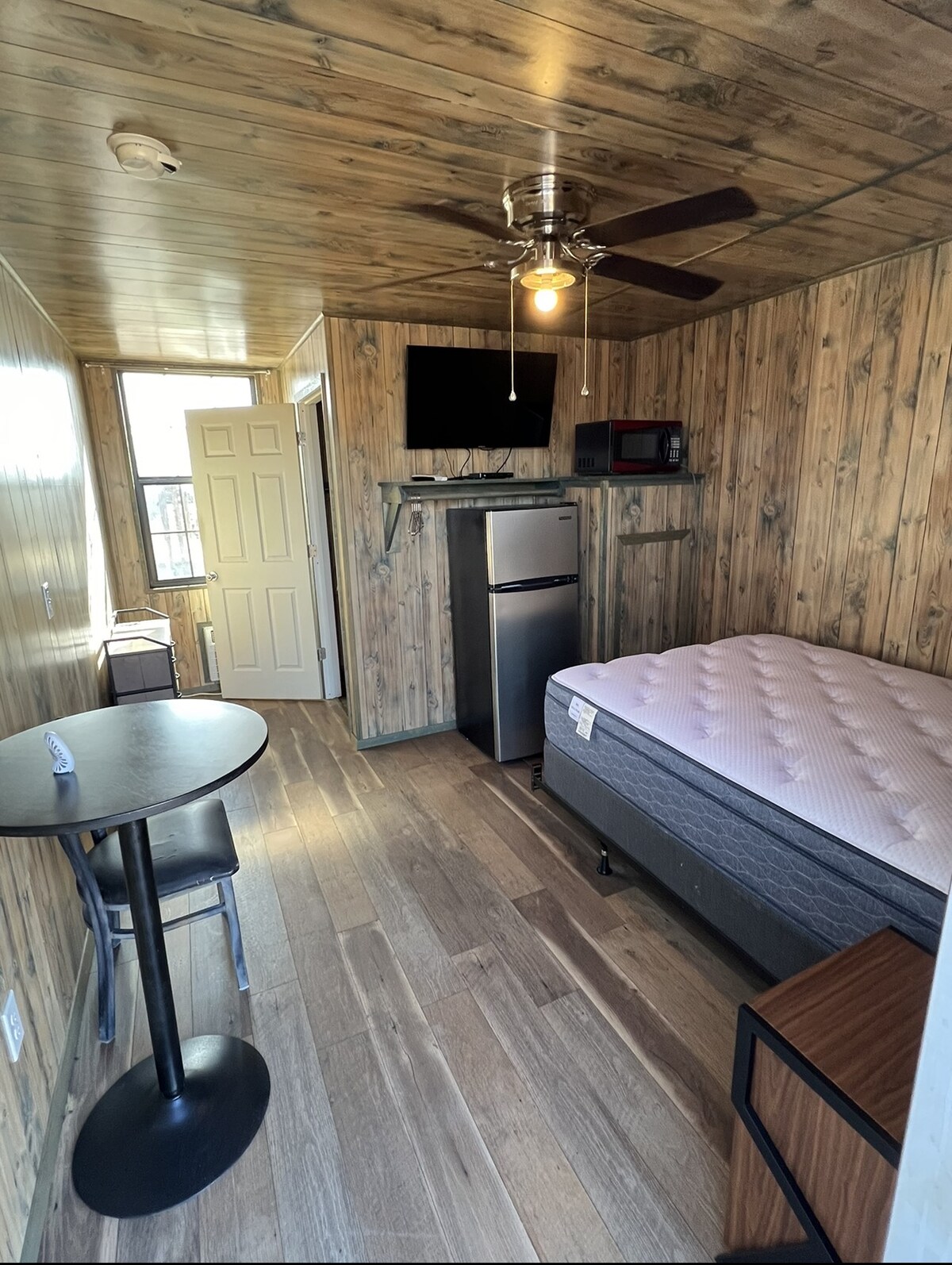 Diese kleine rustikale Effizienzeinheit eignet sich hervorragend für Kurzaufenthalte. Wir haben das Zimmer sauber und für deinen Aufenthalt vorbereitet. Dein Bett hat frische Bettwäsche zusammen mit sauberen Handtüchern für deinen Gebrauch. Es gibt zwei Grills außerhalb der fünf Einheiten, die du zum Kochen oder zum Sitzen am Feuer verwenden kannst. Im Raum gibt es auch einen Kühlschrank und eine Mikrowelle für deine Nutzung. WLAN ist in dieser Unterkunft verfügbar. Wenn das Parken eng ist oder ein Anhänger gezogen wird, steht auf der anderen Straßenseite zusätzlicher Parkplatz zur Verfügung.