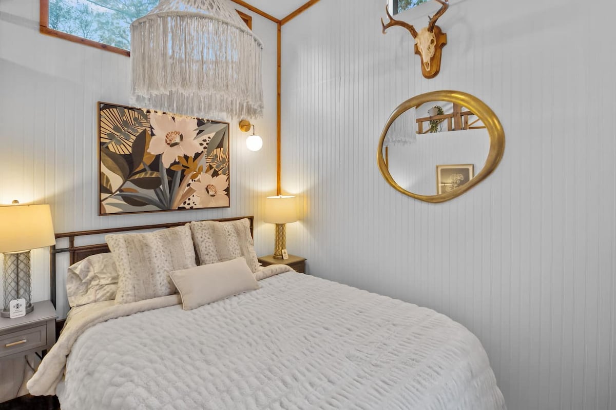 Emerald Cove: A stylish blend of rustic charm and Mid-Century Modern design, located right on the lake! Bedroom Features: Master Bedroom: Luxurious king-sized bed Second Bedroom: Bunk beds and a cozy daybed with a trundle Relaxation Spaces: Screened Porch: Two swinging hammock chairs Sectional seating Side Porch Swing: Perfect for soaking in the best lake views Hanging saucer rope swing Fire Pit Charcoal Grill 5 Cabins available, we can comfortably sleep 34