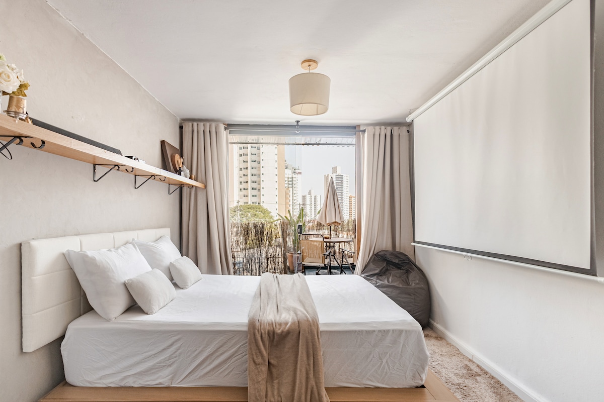 Fühlen Sie sich in diesem neu renovierten Designstudio wie zu Hause, in dem jedes Detail für Ihren Komfort gestaltet wurde. Das minimalistische Dekor schafft einen ruhigen, raffinierten Rückzugsort nach einem intensiven Tag in São Paulo. Integrierter Raum mit einem Doppelbett, einem Einzelbett, einer Küche, einer Waschmaschine und einer Klimaanlage für bis zu 3 Personen. Der beleuchtete Balkon ist ideal zum Arbeiten, Lesen oder Entspannen. Das Gebäude mit 24-Stunden-Concierge garantiert Sicherheit. Ruhige Wohngegend mit öffentlichen Verkehrsmitteln, Märkten und Restaurants in der Nähe.