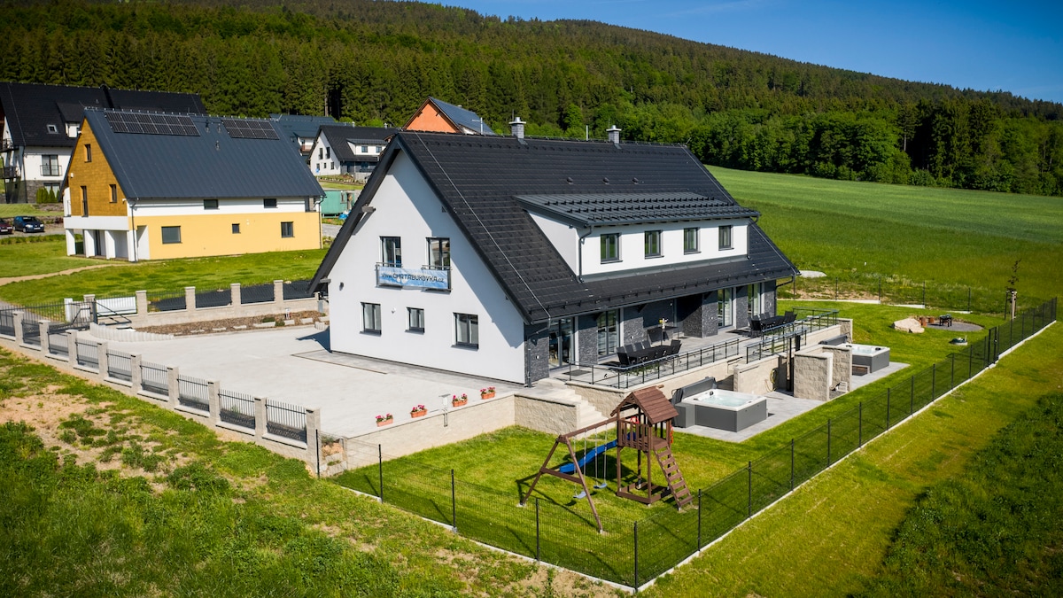 Stilvolle Unterkunft im Herzen des Isergebirges, wo jeder seine eigenen finden wird - ideal für Liebhaber von Wandern und Radfahren, für eine Gruppe von Freunden und Familie mit Kindern, für Adrenalinsuchende, die die Singltrek Pod Smrkem und diejenigen, die Ruhe und Entspannung auf dem Land..... oder mit Wein im Whirlpool genießen werden. Die Kinder fühlen sich bei uns wohl - wir dachten an sie. Sie werden ein Paradies-Haus mit einer Rutsche, einem Sandkasten, einem Bett aus Blaubeeren, ihrem eigenen Bach und allem anderen finden, was sie brauchen könnten.