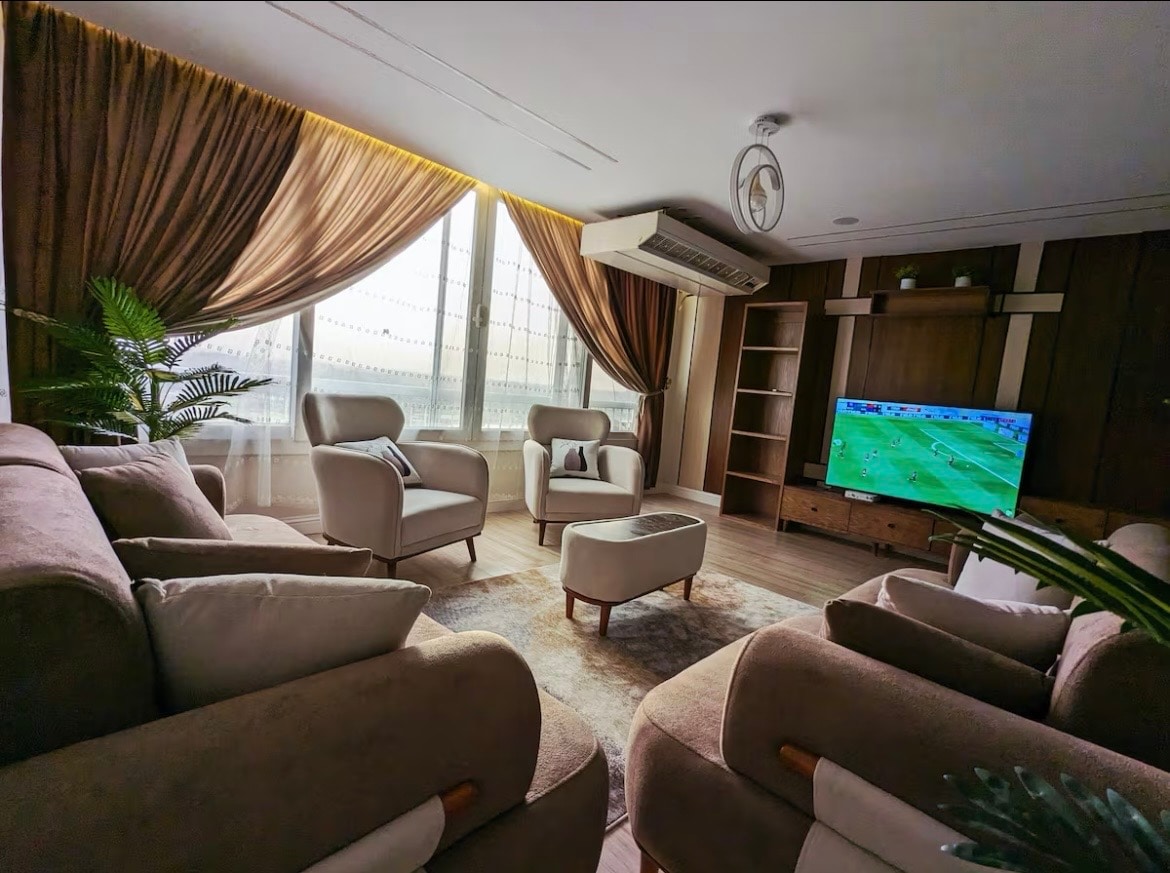 This stylish place to stay is perfect for group trips. -Experience luxury and serenity in this spacious 36th-floor apartment, offering breathtaking views of Cairo's skyline and the iconic Nile River. Thoughtfully designed, the apartment blends vintage charm with modern comforts, creating a perfect retreat for families or professionals. Relax in the elegantly furnished living area, dine in style, or enjoy the stunning nighttime views from the private balcony.