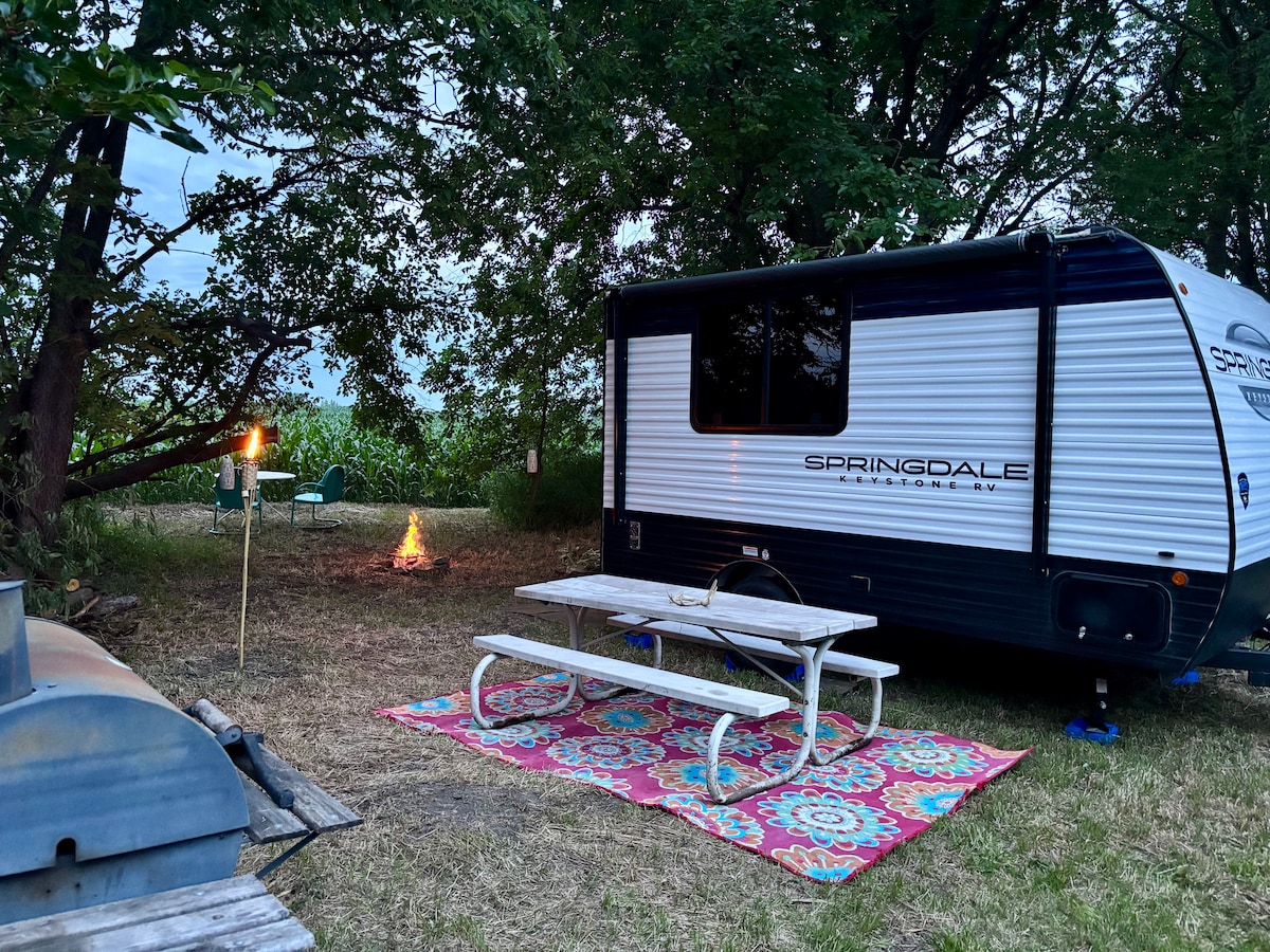 Closed for winter! Book now for spring/summer 2026! Right off 36 Highway! Relax in nature for a night of stargazing in our brand new adorable tiny camper! You will stay next to an 1800’s era windmill in a canopy of trees that frame the stars perfectly! Outdoor fire pit, chairs, dining area & grill. Expect a possible visit from our dogs and cats. Enjoy peaceful relaxing sunsets in a rustic setting!