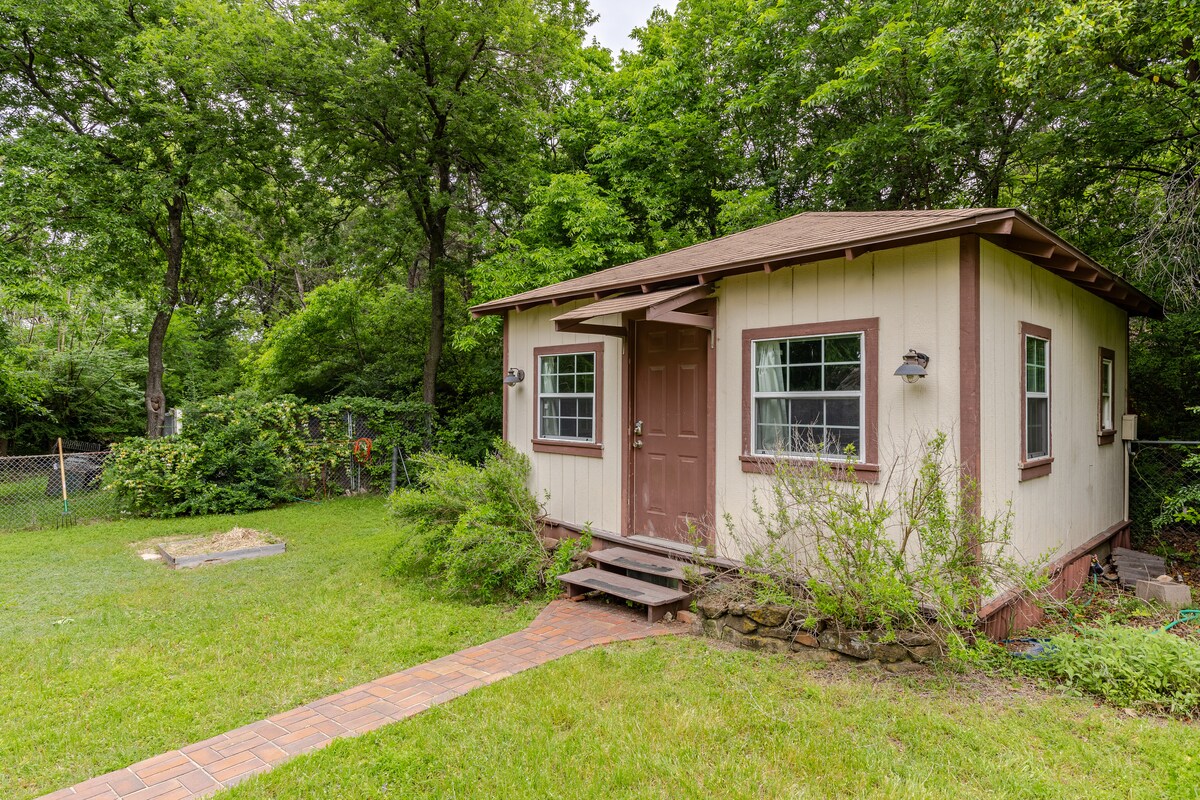 Kleines Gästehaus in Studio-Größe auf großem, ruhigem, bewaldetem Grundstück. Privatsphäre und Küchenzeile machen dieses Nichtraucher-Refugium perfekt für mehrtägige Aufenthalte. Bequem zur Innenstadt von Dallas und den südlichen Vororten von Dallas. Die Küche verfügt über einen Minikühlschrank mit Gefrierfach, eine Kaffeemaschine und eine Mikrowelle. Kaffee, Tee, Besteck und grundlegende Zubereitungs- und Aufbewahrungsartikel für Lebensmittel werden bereitgestellt. Queensize-Bett mit Memory-Schaum-Matratze. Ausklappbarer Schaumstoffstuhl für zusätzlichen Schlafplatz. Halbbad mit Dusche und Toilette.