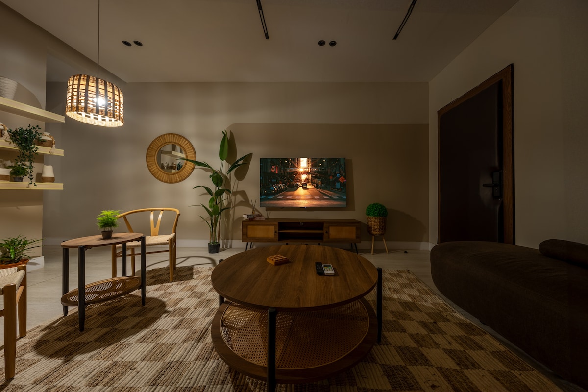 Lebe stilvoll in dieser Boho-Chic-Suite mit 1 Schlafzimmer in Dhahrat Laban! Erdgeschoss mit privater Atmosphäre, gemütlicher Beleuchtung, Designermöbeln, schnellem WLAN, Smart-TV und einer voll ausgestatteten Küche. Perfekt für Profis oder Paare, die einen warmen, erholsamen Aufenthalt in der Nähe von KSU und wichtigen Orten der Stadt wünschen. Ein Boutique-Hotel-Feeling – ohne das Preisschild.