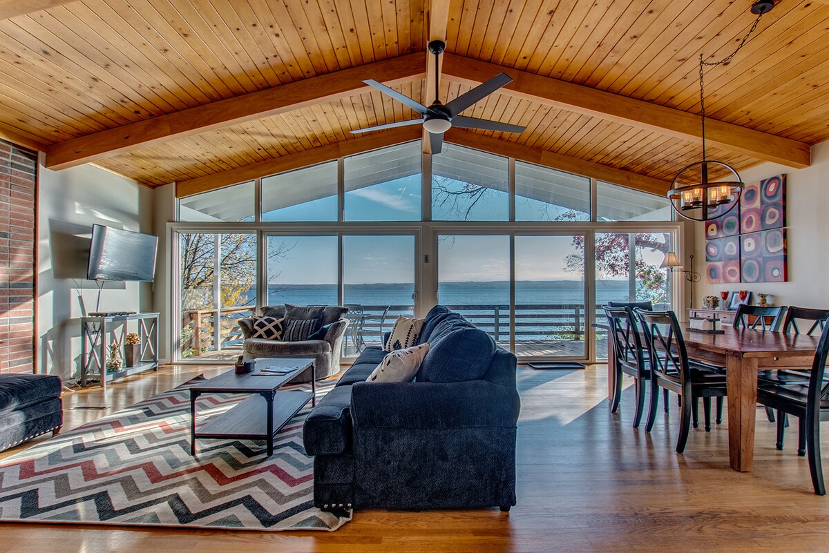 Wir sind direkt am See! Die Aussicht ist fantastisch und die Atmosphäre ist ruhig und entspannend. Günstig gelegen. Das voll ausgestattete Ferienhaus ist komfortabel und bietet ein heimeliges Gefühl – sauber, modern. Der Gaskamin bietet zusätzliche Wärme und Ambiente. Fabelhafte Terrasse mit atemberaubender Aussicht! Dock/Strandbereich mit Feuerstelle. Hauptschlafzimmer – beobachte den Sonnenaufgang direkt vom Bett aus! Die Küche ist komplett ausgestattet, Sitzgelegenheiten für 6 Personen, Waschküche und zwei Badezimmer. Viele Parkplätze und ein schöner privater Hof. Bettwäsche inklusive