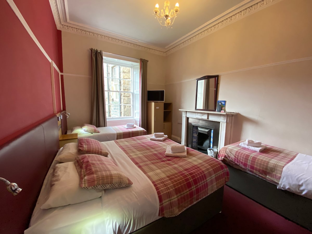 Die Zimmer Loganlea & Harlaw sind über 2 Treppen erreichbar und absolut wunderschön und beide großzügig eingerichtet. Sie verfügen über Gewölbedecken mit freiliegenden originalen viktorianischen Balken, ein renoviertes Panoramafenster mit Blick auf die historische High Street und reichlich natürliches Licht. Die Zimmer sind gemütlich eingerichtet und verfügen über atemberaubende Vorhänge aus Harris-Tweed. Die Teppiche sind hochflorig und fühlen sich unter den Füßen gemütlich an. Dieses Zimmer hat den zusätzlichen Vorteil, dass es ein Zustellbett für ein Kind aufnehmen kann, sodass es perfekt für einen Familienurlaub ist. Das Zimmer verfügt über einen Schreibtisch, einen Ganzkörperspiegel, terrestrischen Digital-TV und -Radio, einen Wasserkocher, individuellen Tee und Kaffee. Ebenfalls vorhanden ist ein leistungsstarker Haartrockner und Bügeleinrichtungen sind an der Rezeption erhältlich. Das eigene Badezimmer ist perfekt ausgestattet mit WC, begehbarer Duschkabine und Waschbecken mit beleuchtetem, beheiztem Spiegel. Wir bieten optionalen Soft-Touch-Hausservice und alle Zimmer verfügen über ein kostenloses Frühstück zum Mitnehmen für den Verzehr in deinem Zimmer.