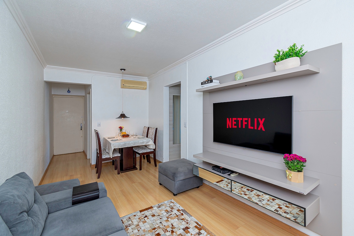 Apartamento de 1 dormitório no bairro Moinhos de Vento (Porto Alegre) próximo a supermercados, farmácia, bancos, padaria, restaurantes, shopping e todas as facilidades do bairro. Cozinha com utensílios, máquina de lavar roupas, sala de estar com sofá cama, tv smart 50", wi-fi (250 Mega). Prédio com portaria 24hs. Vaga de estacionamento coberta.