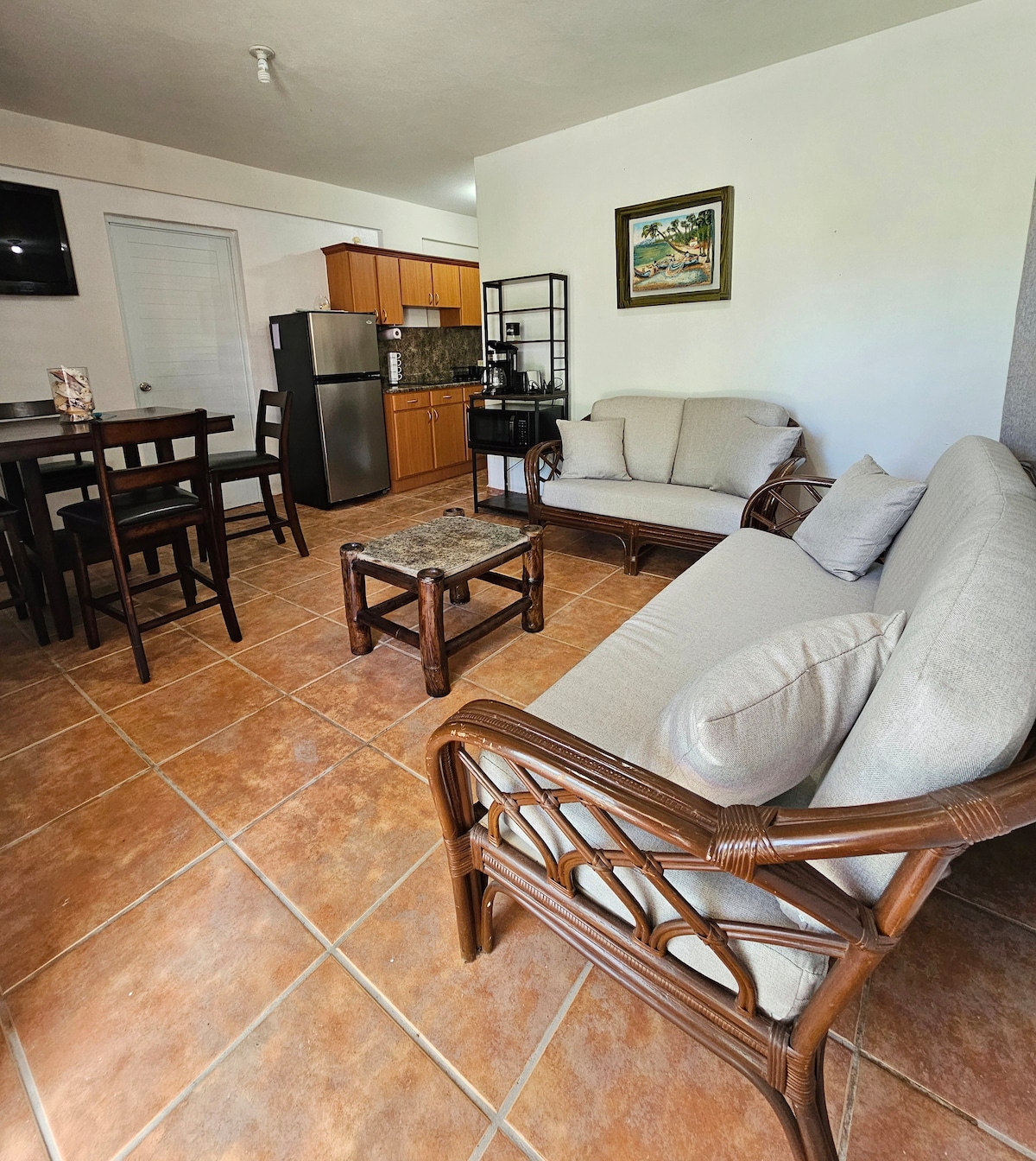 Genieße die private Wohnung im Erdgeschoss in unserem zweistöckigen Haus. Sie verfügt über eine voll ausgestattete offene Küche, Essbereiche im Innen- und Außenbereich, ein Queensize-Bett im Schlafzimmer mit Klimaanlage, ein Sofa, das zu einem zweiten Bett ausziehbar ist, und eine Dusche mit heißem Wasser. Es gibt einen Smart-TV. Der Eingang ist privat und Parkplätze befinden sich direkt vor der Wohnung. Sie befindet sich in der Villa Borinquen, eine 5-minütige Fahrt oder 25 Gehminuten vom Fährhafen und Surf-Breaks entfernt.