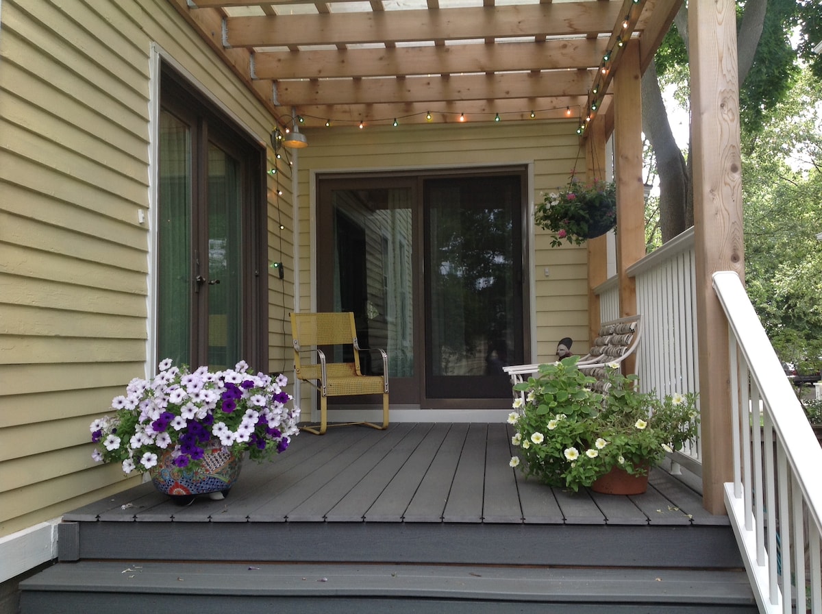 Genieße die Ruhe unseres geheimen Gartens von deinem privaten Gästehaus aus. Genieße die Privatsphäre auf der überdachten Sonnenterrasse. Beobachte Schmetterlinge im Bestäubergarten. Lausche dem Abend im Innenhof mit Blick in den Garten. Drehe einige Platten aus der vielseitigen Sammlung. Schlendere durch die grüne Nachbarschaft. 5 Gehminuten von der Divvy-Fahrradstation aus hast du Zugang zu ganz Chicago und dem CTA/Metra-Zug. Kurze Fahrt zum See, zum Nordwesten, zur Innenstadt.