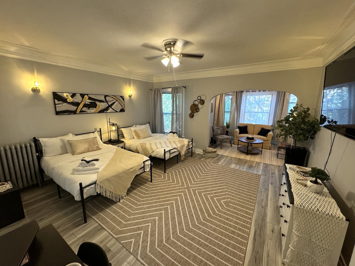 Komm zusammen, entspanne und genieße diese geräumige, neu dekorierte 3-Zimmer-Wohnung, die von Kunstwerken einheimischer Künstler umgeben ist. Mach es dir im Winter mit einem Innenkamin und einer Außenfeuerstelle gemütlich oder kühle dich im Sommer am nahe gelegenen Strand ab. Die Unterkunft liegt in einem von Bäumen gesäumten historischen Viertel in der Nähe von lokalen Geschäften, Restaurants, Cafés, Brauereien und einer Weinbar. In der Nähe von öffentlichen Verkehrsmitteln wie Zügen, Bussen und Fahrradverleihen, um die Northwestern University, Chicago, den Lake Michigan und vieles mehr zu erkunden und zu besuchen.