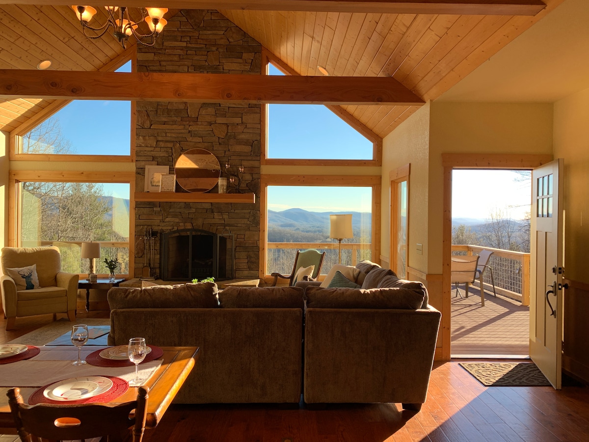 Atemberaubende Bergblick, eine voll ausgestattete Gourmet-Küche und der gleiche Komfort wie zu Hause erwarten dich in diesem Haus weniger als zwanzig Minuten von der Innenstadt von Asheville entfernt. Dieser wirklich private Rückzugsort umfasst zwei offene Wohnbereiche und eine große Terrasse mit 180-Grad-Blick, bequeme Betten, mehrere Sitzbereiche im Innen- und Außenbereich, Spiele, Filme, Satellitenfernsehen und Bücher sowie Spielzeug, einen Kindersitz, einen Hochstuhl, ein Kinderbett und ein Reisebett für Familien mit Kindern. Für die Zufahrt wird ein Fahrzeug mit Allradantrieb empfohlen.